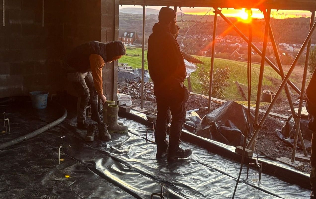 As the sun rose over the mountains, warming the faces of the Liquid Screed Specialists (LSS) team in the quiet hills of Gilfach Goch, we braved the morning chill and slid on our ice-cold welly’s – the true sign of a hardworking start to the day.