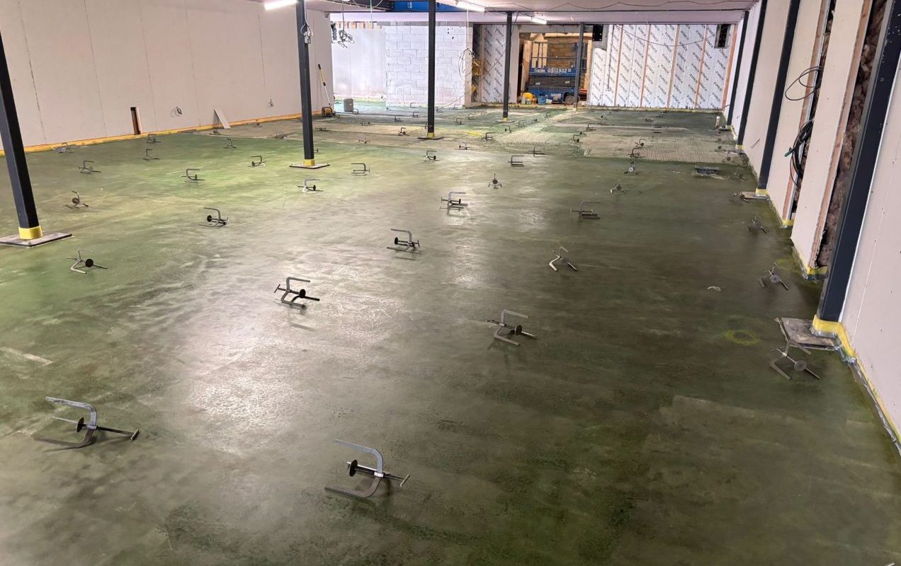 Next came two coats of primer, followed by installing an 8mm edging strip around all perimeter walls. With the groundwork set, we placed over 200 tripods to ensure perfect levels throughout.